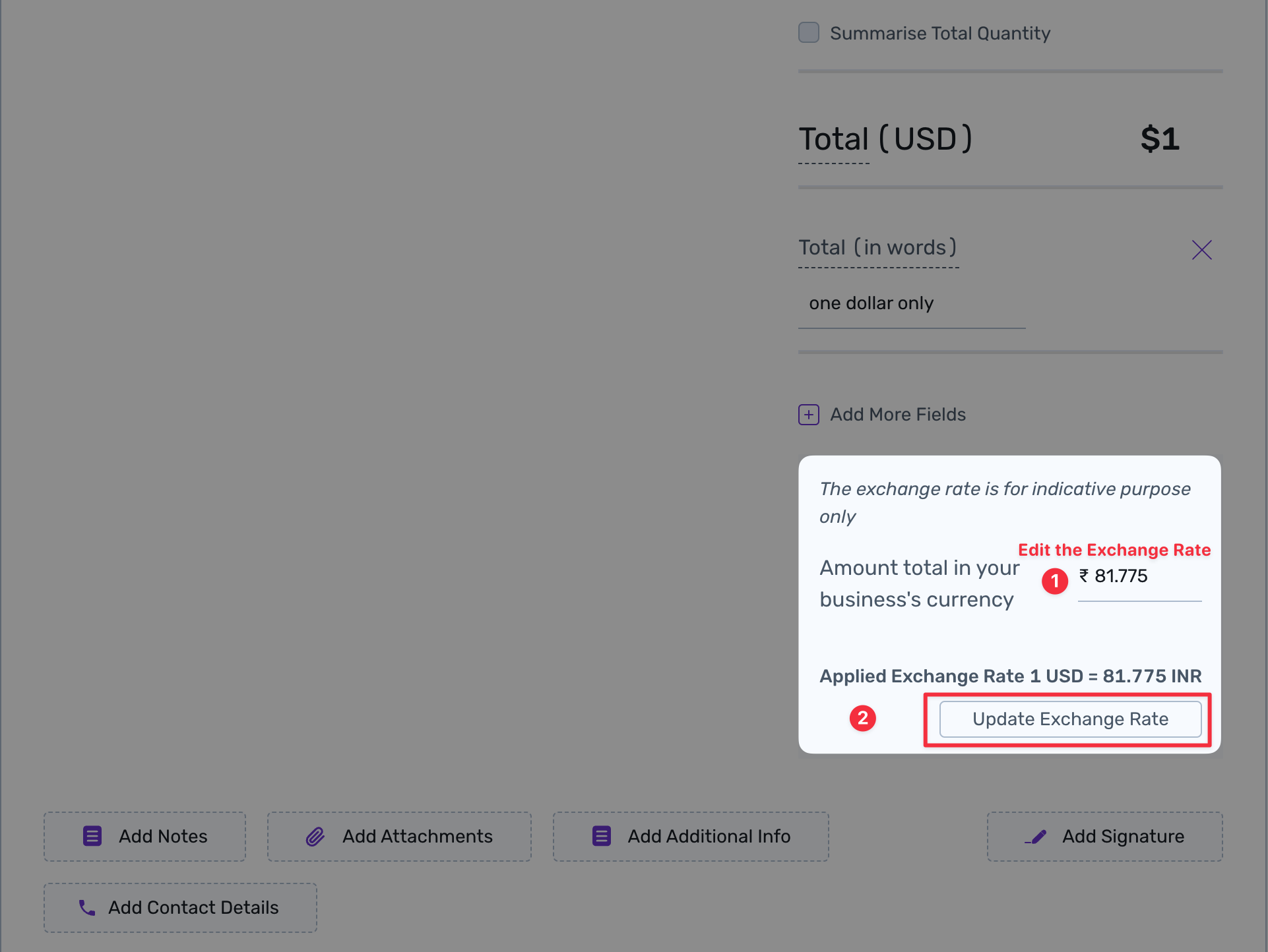 For export invoices, ensure that you mention the correct conversion rates on which you want to create the e-invoice. You can set the Conversion rates in your invoice itself: