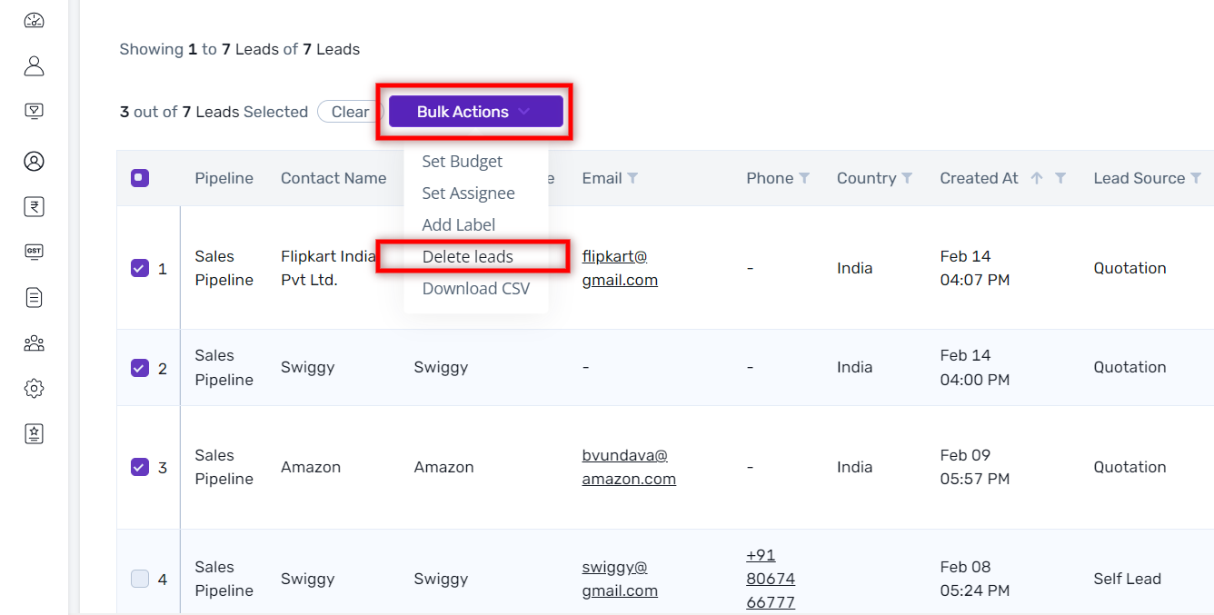 Select all the leads you want to delete by clicking on their respective checkbox - as shown below: