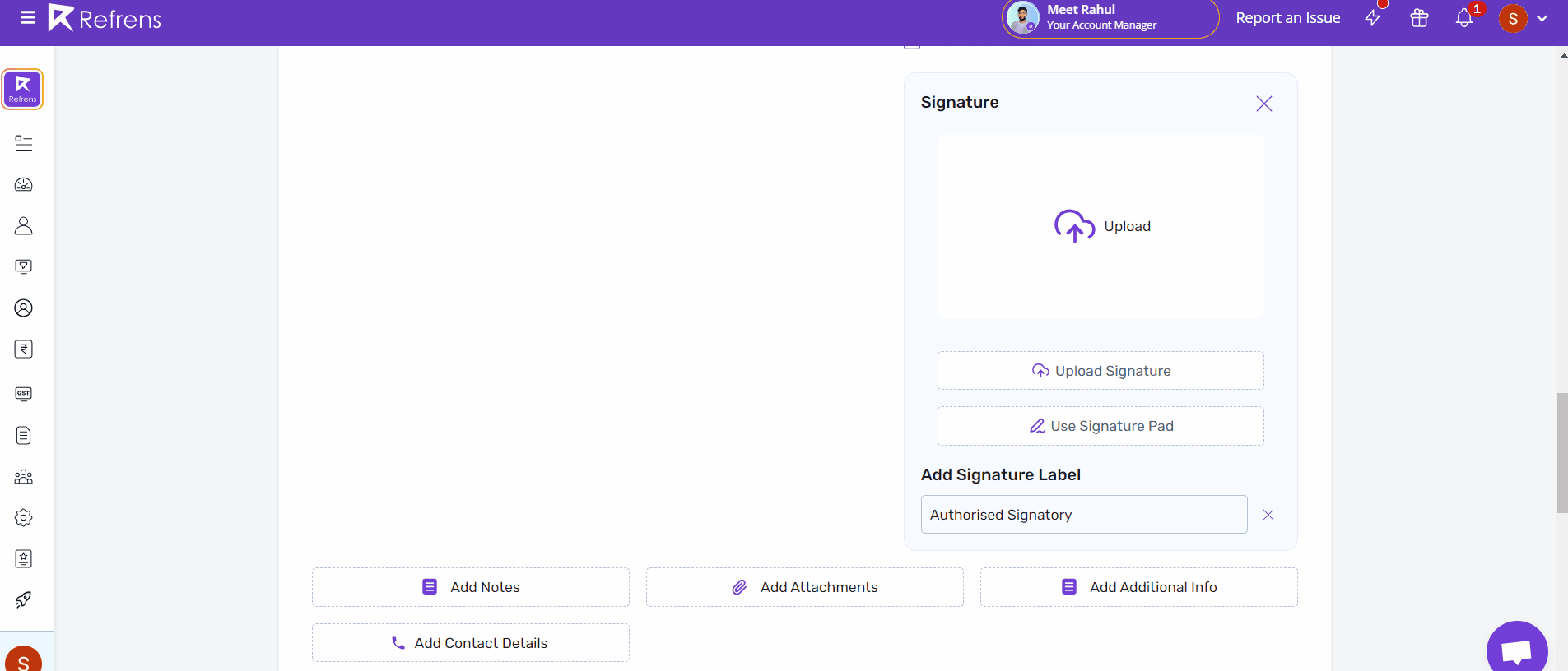 The best part? You have to add your signature only once! Refrens will automatically add your signature to the respective accounting documents you create in the future. (you can edit/remove it if you want)
