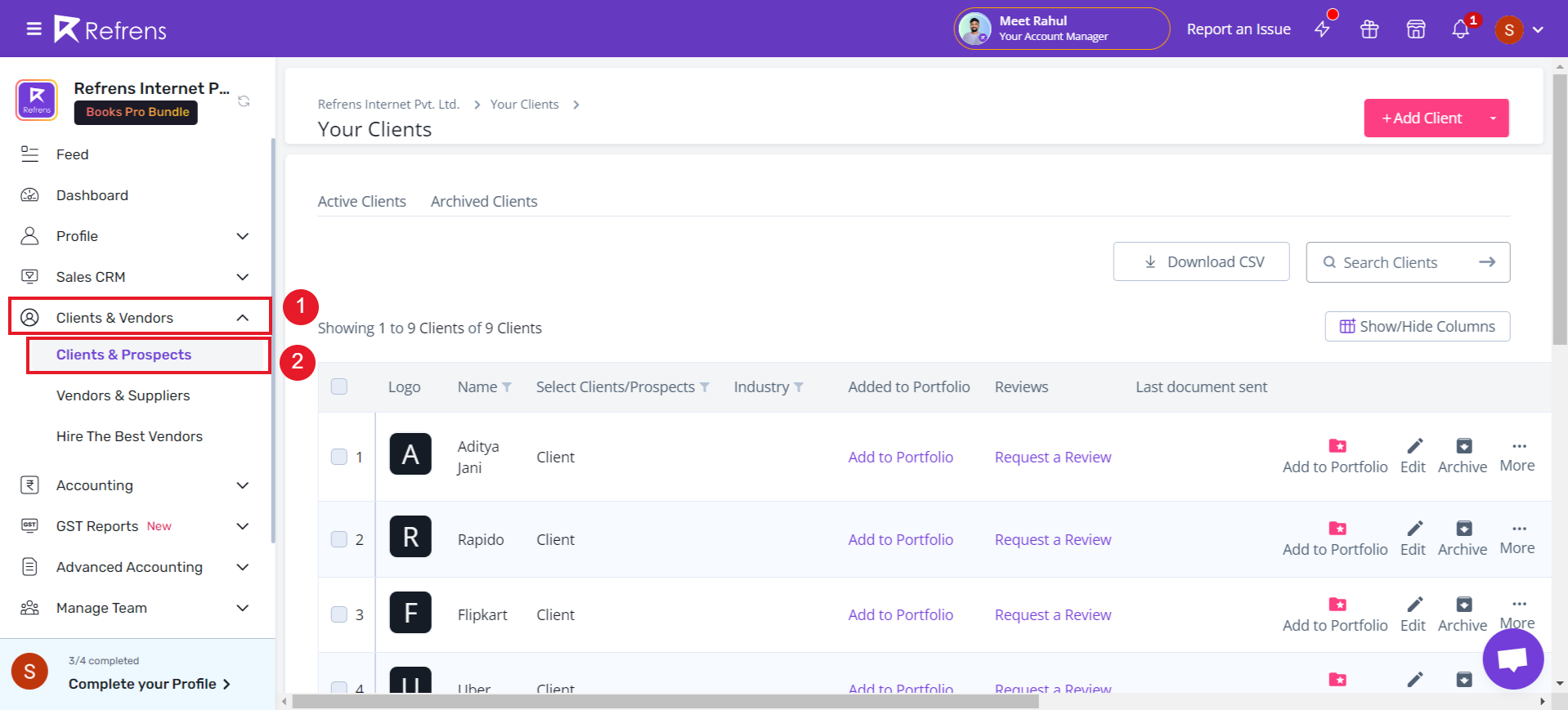 If you want to delete a client/prospect due to duplicate entries or any other reason, you can do that with ease on Refrens.