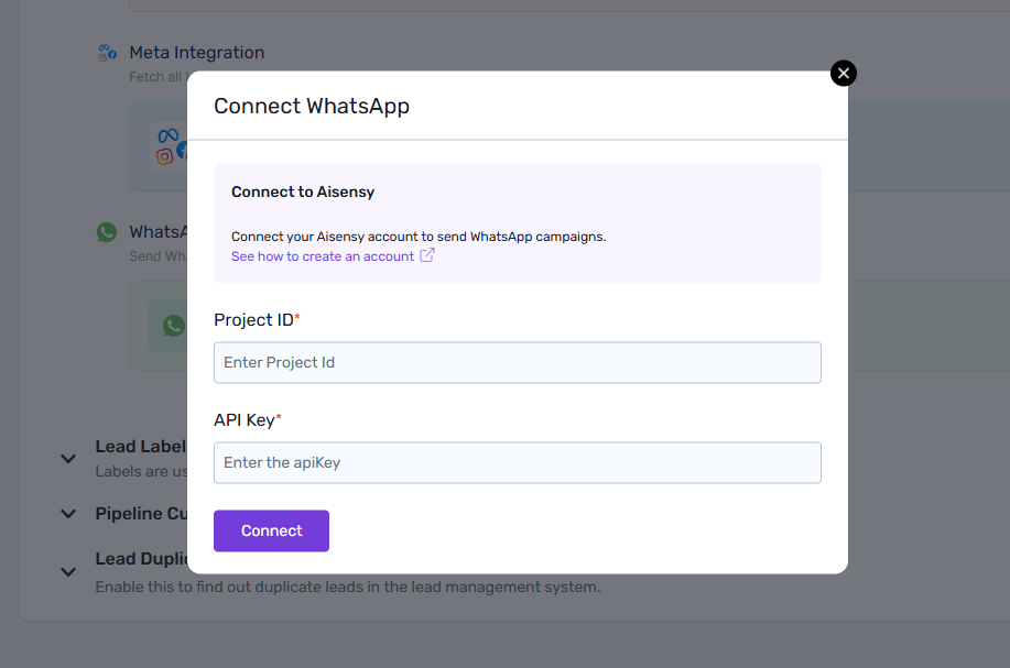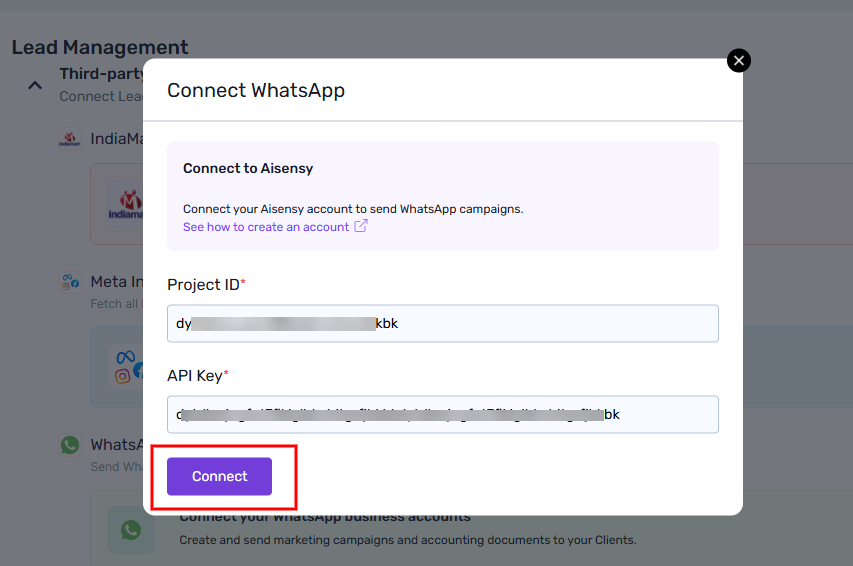 Go to Business Settings > Lead Management > Third-party Integration > Connect WhatsApp as shown below: