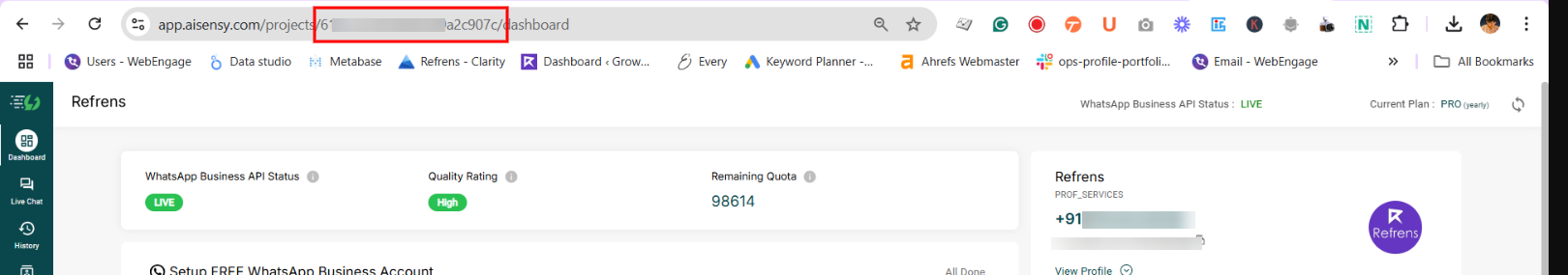 Once your AiSensy account is set up, go to your AiSensy account. You will see your Project ID in the URL as highlighted below: