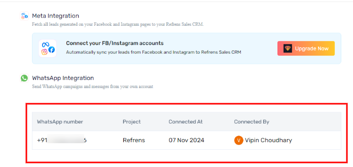 That’s it! You have successfully connected your WhatsApp Business Account with Refrens. You will the details in your WhatsApp Integration section like this:
