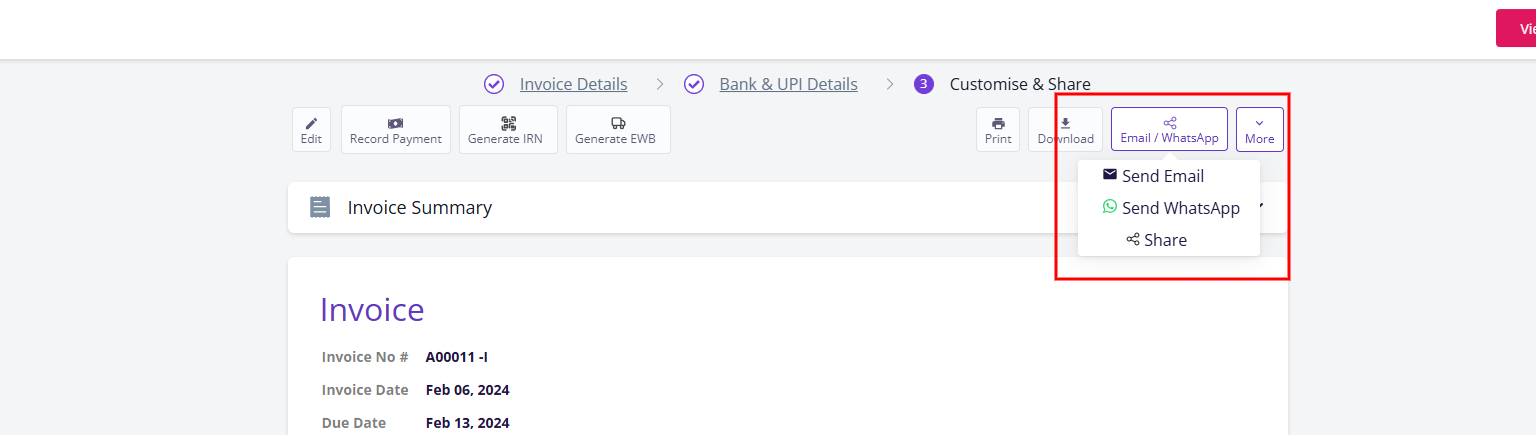 To send documents such as invoices, quotations, etc. via WhatsApp, go to the document preview page and click on “Send WhatsApp”: