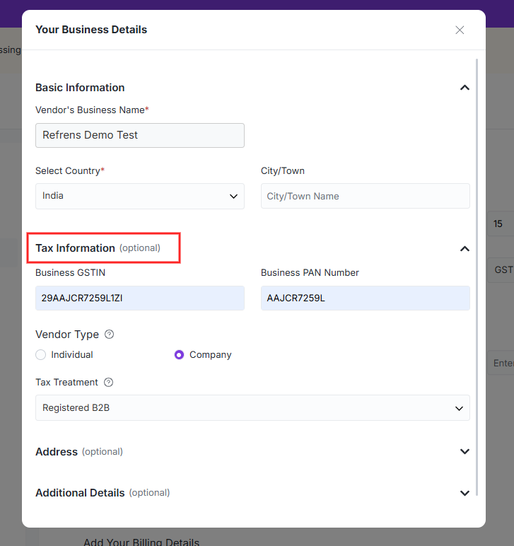 Just go to the "Tax Information" section to add/edit the GST/VAT/SST/TIN, PAN, and other tax-related details of your Client/Vendor.