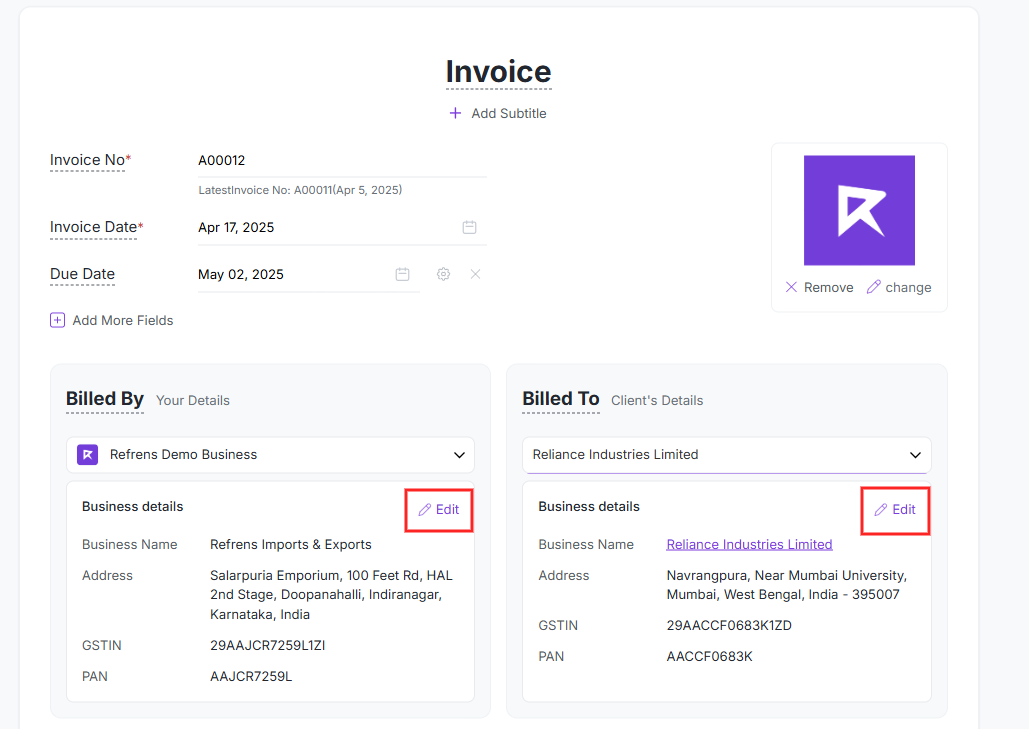 While creating documents, you will see an "Edit" icon in your Billed By and Billed To details: