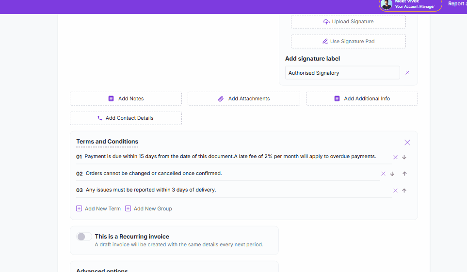 The great part? Once saved, the same terms and conditions will automatically carry forward to your future documents as well! This helps you save time by avoiding manual typing each time.